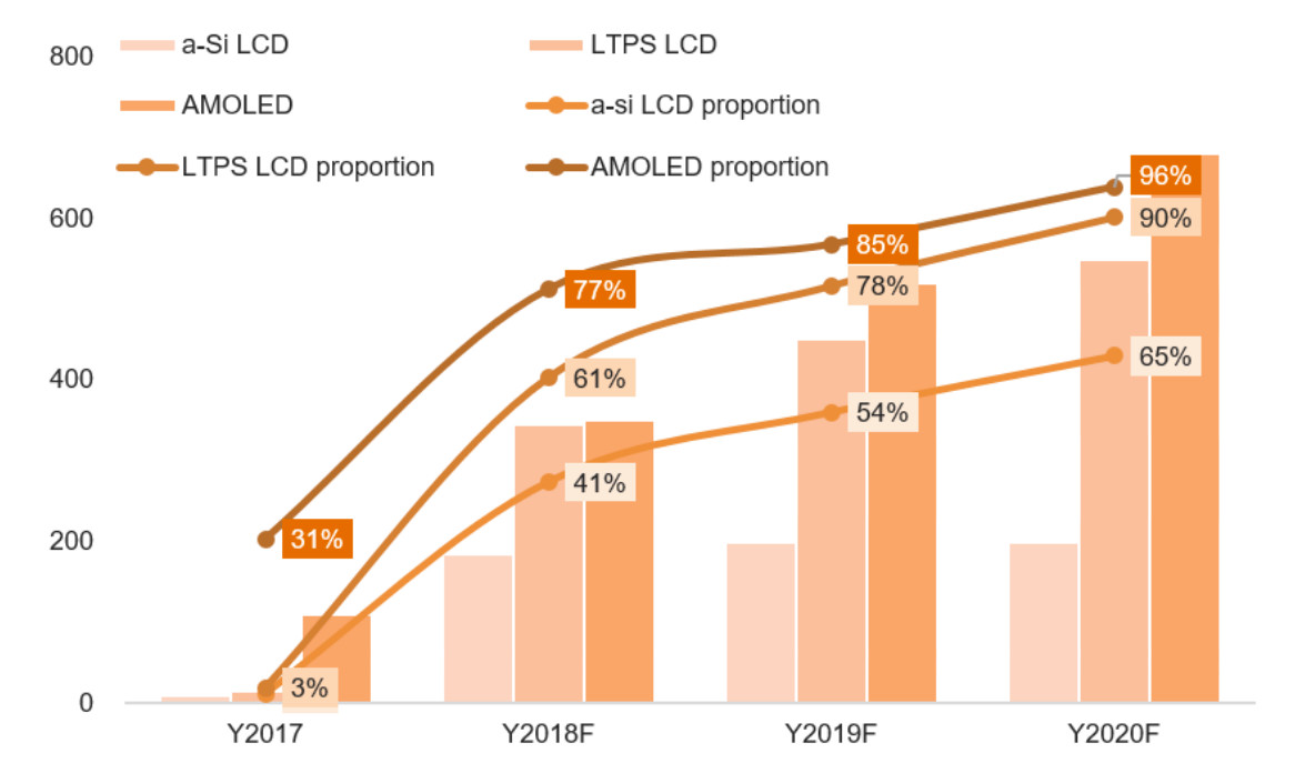 从中长期来看,未来全面屏渗透程度还将不断深化,并向全产品线普及。根据群智咨询(Sigmaintell)的预测,全面屏在全部智能手机面板出货中的占比将从2018年的60%提高到2020年的90%。AMOLED以及LTPS LCD规格产品中的全面屏渗透率在2020年都将达到或超过90%。而伴随着全面屏趋势在中低端产品领域的普及,到2020年,a-Si LCD智能手机面板产品中全面屏的渗透率也将达到65%。