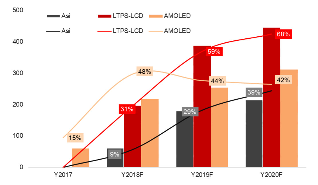 因此,我们预计从2019年起,无开槽全面屏设计的手机产品将逐渐增多,尤其是在高端产品领域将有较为明显的增长。而这将对在高端手机领域占有优势的AMOLED面板形成显著推动作用。根据群智咨询(Sigmaintell)的预测,AMOLED面板中异形屏产品的渗透率在2018年达到峰值后在2019年将出现萎缩,无开槽全面屏及开孔全面屏将逐渐蚕食异形全面屏的市场份额。而LTPS LCD及a-Si LCD在未来一段时间内异形屏仍是较为经济的显示解决方案。预计到2020年,LTPS LCD面板产品中异形屏的渗透率将达到68%的水平,而定位较为低端的a-Si LCD面板产品中异形屏的渗透率也将达到39%。